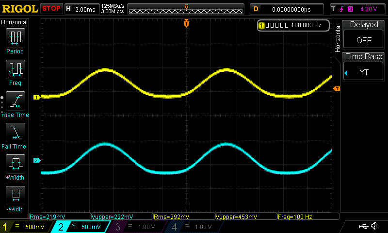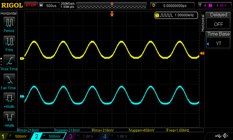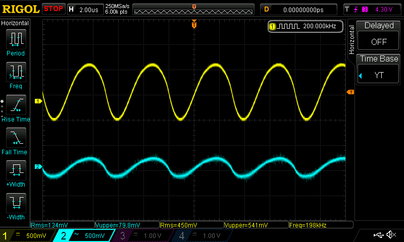 Żółty przebieg to sygnał na rezystorze, niebieski przebieg to sygnał na wyjściu konwertera.