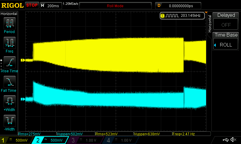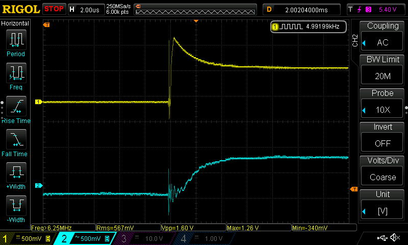 Załączenie prądu również jest widoczne jako wygładzony narastający przebieg na wyjściu konwertera (niebieski) w porównaniu do napięcia na rezystorze (żółty).
