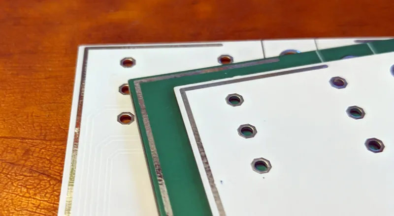 Każda płytka PCB w stosie ma odsłoniętą miedź wzdłuż obwodu. Po nałożeniu pasty lutowniczej i zaciśnięciu płytek można je razem zlutować.
