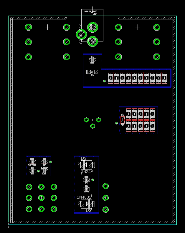 Ta płyta drukowana została początkowo skonstruowana poprzez ułożenie komponentów przewlekłych w logicznych miejscach, a następnie umieszczenie elementów do montażu powierzchniowego w obszarach, które miały największy sens. Ponownie, jest to nadzwyczaj prosty obwód z mniej niż dziesięcioma detalami w schemacie. Po wykonaniu tego kroku wystarczyło skopiować PCB do nowego pliku i dodać wycięcia wokół komponentów. Płytka ta została zaprojektowana w programie Eagle. Dało to autorowi możliwość prostego dodania wielu warstw do PCB, które można było następnie uwzględnić w menedżerze CAM w celu utworzenia odpowiednich plików Gerber.