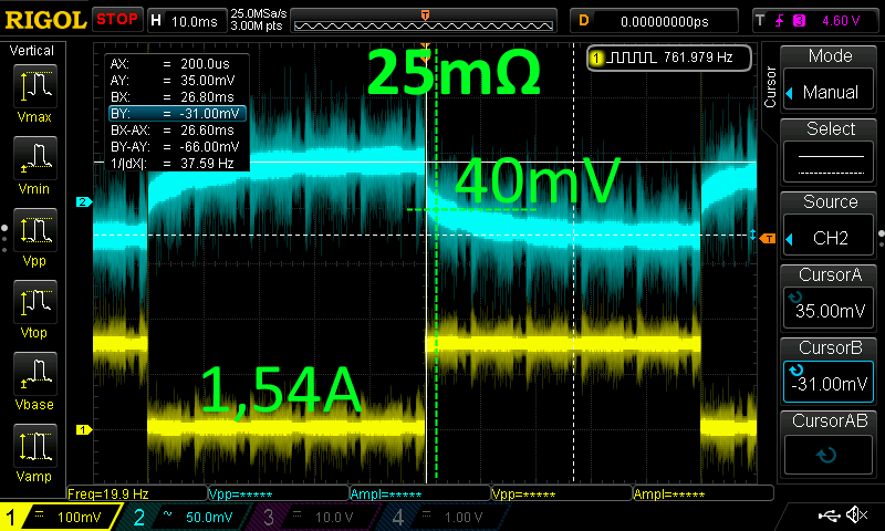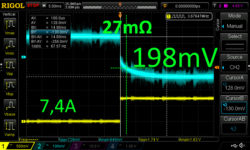 Po 2ms napięcie nie spada jeszcze do stabilnej wartości i przy niższym spadku napięcia otrzymujemy niższy wynik Rw około 25mΩ.