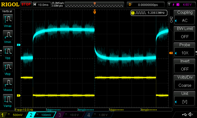 Tester KW600 wykorzystuje przebieg 250Hz włączony na 400ms, w cyklu pomiarowym rezystancja jest załączana i odłączana na ~2ms.