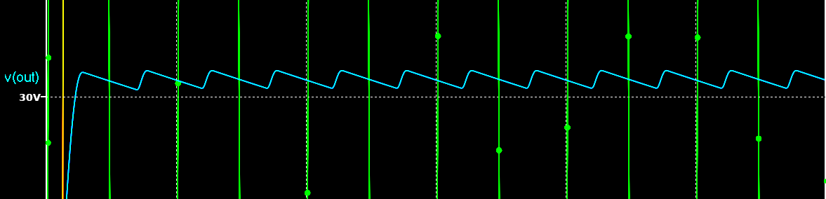 * Niebieski sygnał V(OUT), z podziałką po lewej stronie, reprezentuje ciągłe napięcie wyjściowe. Jego wartość stanowi około 31 V.