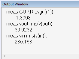 * .meas vin rms(v(in)): ta dyrektywa służy do pomiaru wartości skutecznej (RMS) napięcia wejściowego obwodu podczas symulacji. To polecenie pozwala obliczyć i wyświetlić wartość RMS napięcia wyjściowego. Rezultat tego pomiaru będzie dostępny w wynikach tekstowych symulacji (zobacz rysunek 3). Pomiar RMS reprezentuje wartość, która jest miarą efektywnej amplitudy danego sygnału. W tym konkretnym przypadku: „rms(v(in))” oblicza wartość RMS napięcia wejściowego: „v(in)” w obwodzie, jako że jest to napięcie zmiennoprądowe o przebiegu sinusoidalnym. Przeprowadzony pomiar zwraca wartość RMS wynoszącą około 230 V.