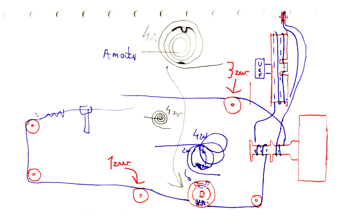 z tym, że jak widać na dwóch kołach nawinąłem 1 zw i 3 zw (uwzględniłem to na rysunku). Zrobiłem to z żyłki wędkarskiej