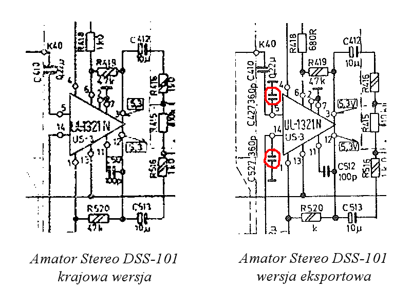 Na sam koniec postanowiłem usunąć filtr kontur, przez który musiałem słuchać odbiornika przy wyciętych basach. Zrobiłem to przez usunięcie C515 i C414, odlutowałem także odczep potencjometru.