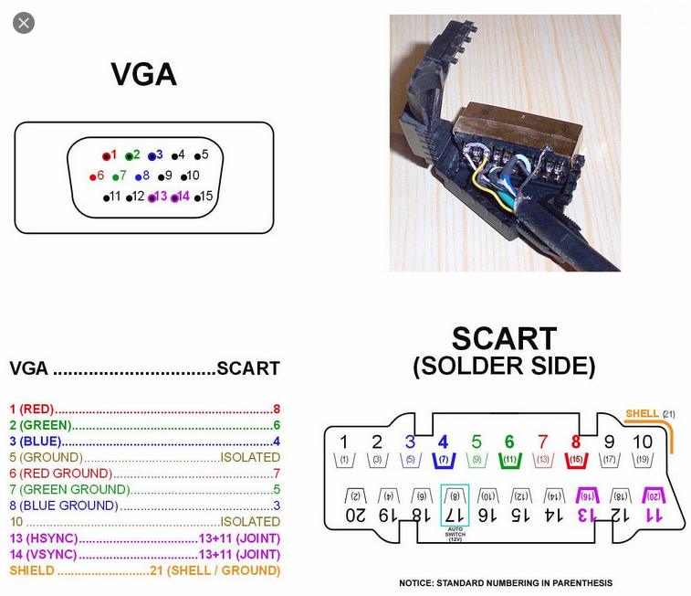 Mam Commodore 64. Chciałbym podłączyć złącze video do VGA. Chciałbym zrobić adapter ze złącza DIN 5, bo niestety takie tylko mam, ale powinno działać, czytałem i chciałbym to zrobić bez rezystorów, kondensatorów itp. Znalazłem taki schemat. Nie wiem, czy dobry. I mógłbym prosić o schemat, który pin idzie gdzie, na złączach męskich, bo na rysunkach nie widzę, który to męski, a który żeński.