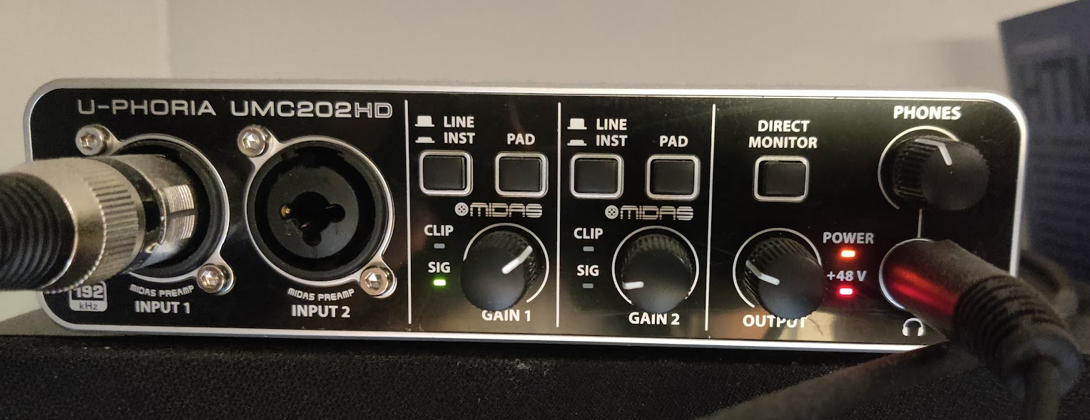 Na zdjęciu widać interfejs audio U-PHORIA UMC202HD. Przyciski LINE, INST oraz PAD na interfejsie audio są często spotykane i służą do odpowiedniej konfiguracji wejść: