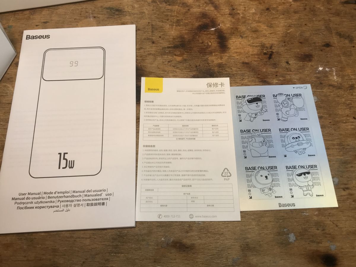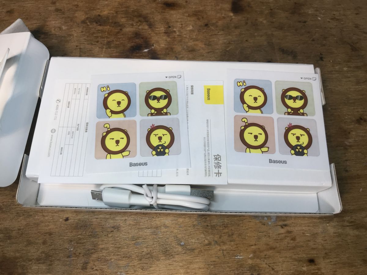 Najpierw zawartość zestawu. Z powerbankiem dostajemy kabelek i nalepki.