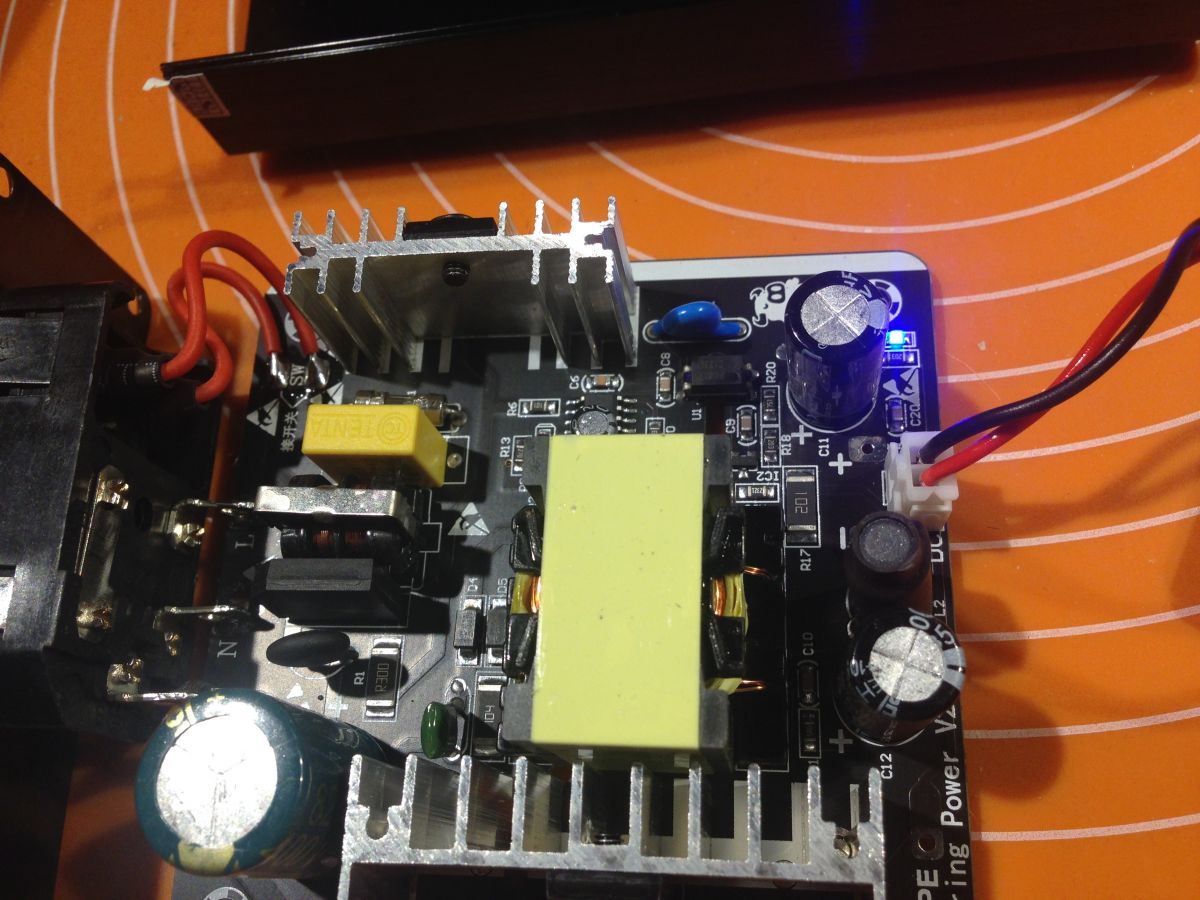 Sam zasilacz - jak już pisałem - to typowy zasilacz impulsowy, tyle że o stosunkowo dużej mocy (też wspomniałem - 120W) i dość "sztywny" - z tego co sprawdziłem niezależnie od tego czy aktualnie podaje napięcie na grzałkę czy nie, napięcie wyjściowe wynosi 24V. Oczywiście mierzone na gnieździe wyjściowym zasilacza - sama grzałka zasilana jest cyklicznie więc miernik miałby problem z poprawnym pomiarem.