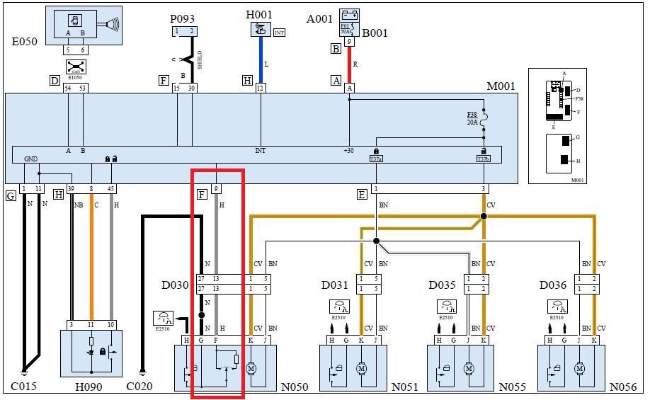 Przewód biały podłączyłem do pinu nr 1 wtyczki "E", a biało-czarny do pinu nr 3 wtyczki "E".