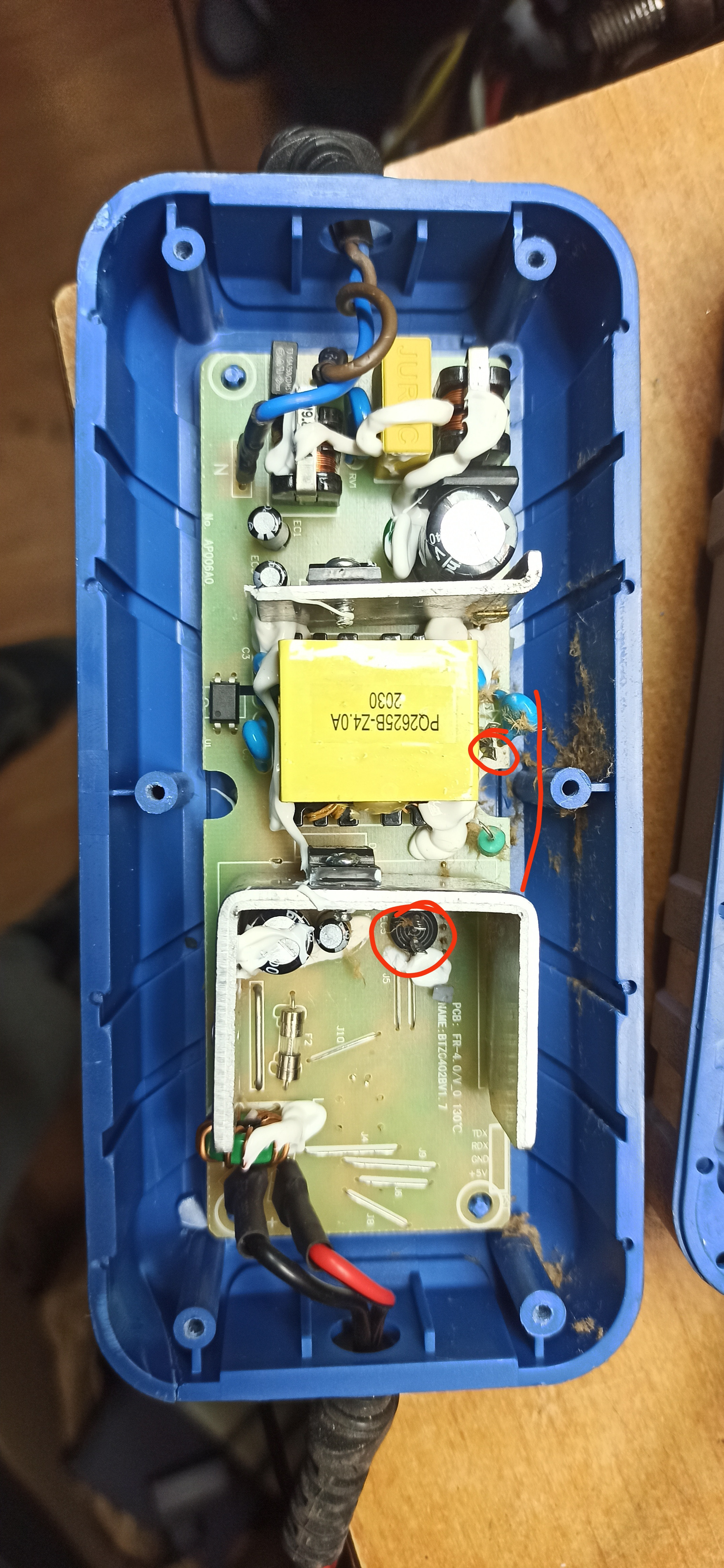 Chodzi o wymianę dwóch kondensatorów zaznaczonych na zdjęciu.