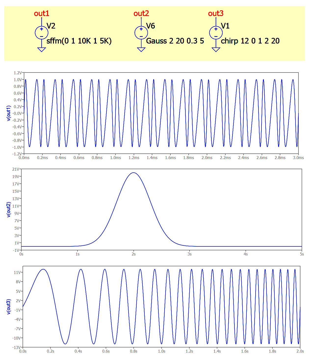 Dla czasów przed T1 napięcie jest falą sinusową o amplitudzie AMP i częstotliwości FREQ1; dla czasów między T1 a T2 częstotliwość zmienia się liniowo między FREQ1 a FREQ2. Może być podana dowolna liczba punktów czasu-częstotliwość. Dla czasów po ostatnim czasie częstotliwość pozostaje na poziomie ostatniej częstotliwości.