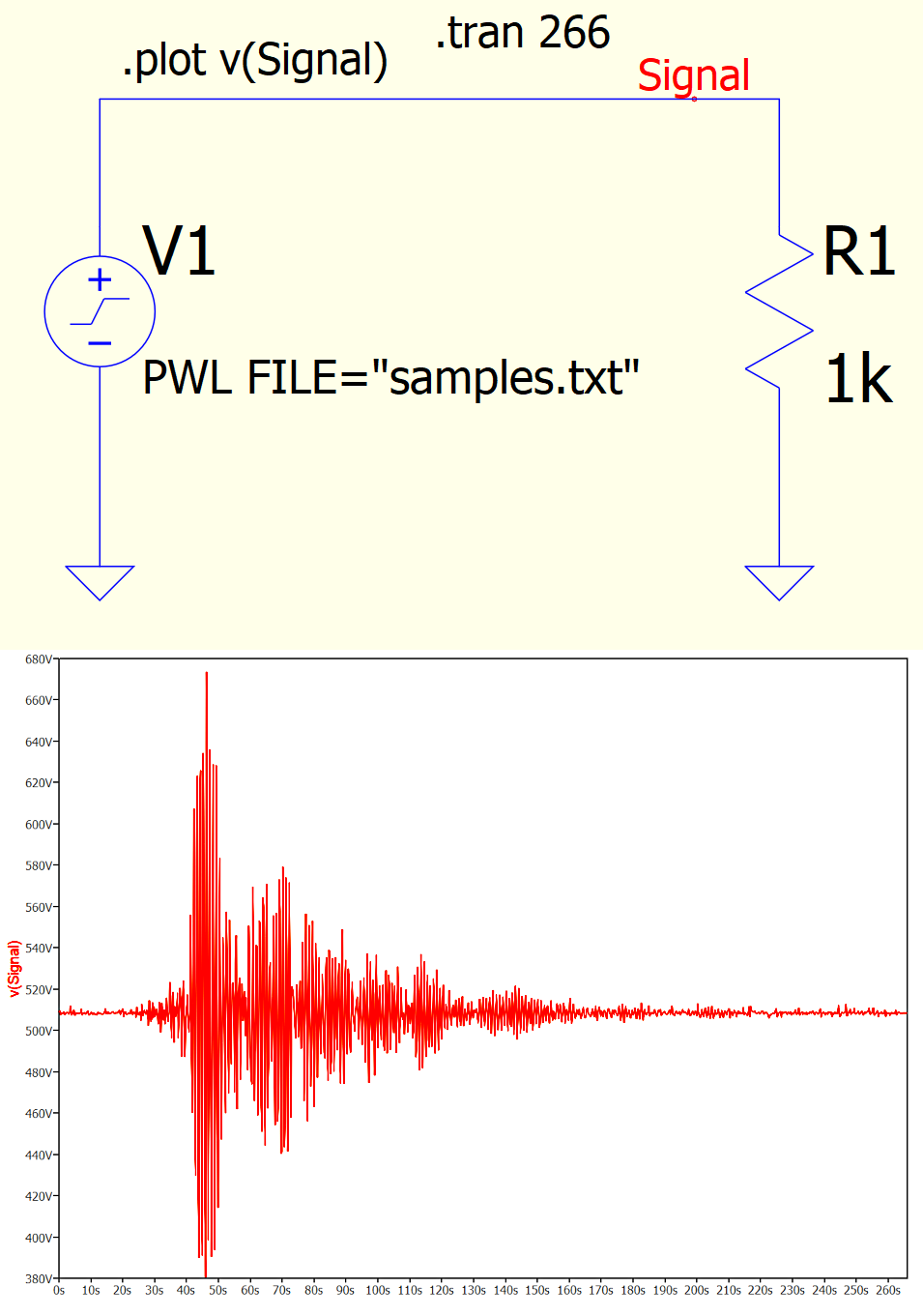 Poniższy przykład, przedstawiony na rysunku 1, pokazuje przebieg trzęsienia ziemi zarejestrowanego przez specjalny czujnik. Generator wyświetla rzeczywisty ślad sejsmiczny trwający około 264 sekundy. Pokazany jest również schemat elektryczny do użycia, który obejmuje generator PWL i opornik obciążenia. Sygnał jest pobierany z węzła: „Signal”. Plik tekstowy zawierający próbki to: „samples.txt” i ma następujące cechy: