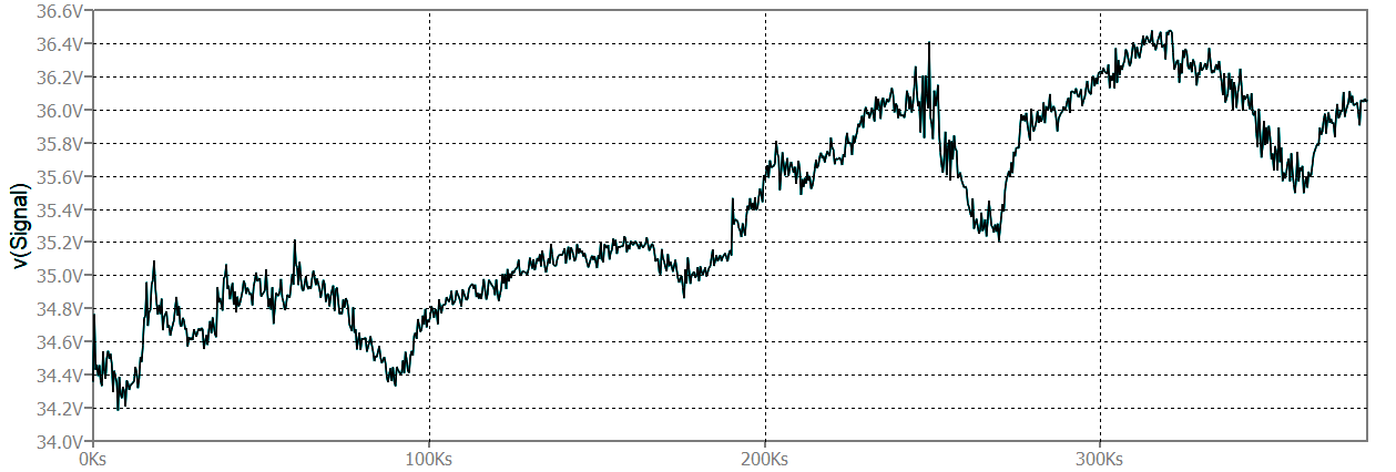 10.000000 , 34.364720Schemat elektryczny jest taki sam jak w poprzednim teście. Uruchomienie symulacji i wyświetlenie napięcia na węźle: „signal” generuje wykres przedstawiony na rysunku 3. Choć generator prezentuje wyniki jako napięcie elektryczne, dane zapisane w archiwum to tak naprawdę pomiar temperatury. Projektanci muszą zawsze brać to pod uwagę. Jak można zrozumieć, pliki PWL są bardzo potężnym narzędziem, które można używać do symulowania różnych rodzajów fal. Oferują one kilka zalet w porównaniu ze wstępnie zdefiniowanymi kształtami tychże, co czyni je praktycznymi w różnorodnych zastosowaniach. Pozwalają one zdefiniować kształty fal z dowolną precyzją. Co umożliwia symulację prawdziwych, które w przeciwnym razie nie mogłyby być reprezentowane przez wstępnie zdefiniowane ani opisane równaniami matematycznymi. Są również przydatne do symulacji i analizy sygnału dźwiękowego lub ogólnie jakiegokolwiek istniejącego sygnału w dziedzinie czasu.