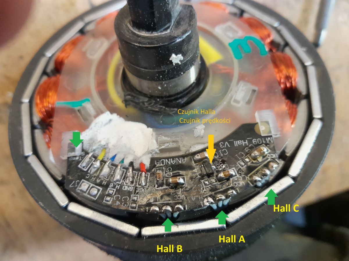 Dopiero jak w obudowie silnika zauważyłem wklejony magnes, który był na wysokości mojego czujnika, który opisany był jako "Temp.sensor" połapałem się że to jednak musi być Hall do pomiaru prędkości wirowania koła a nie czujnik temp.