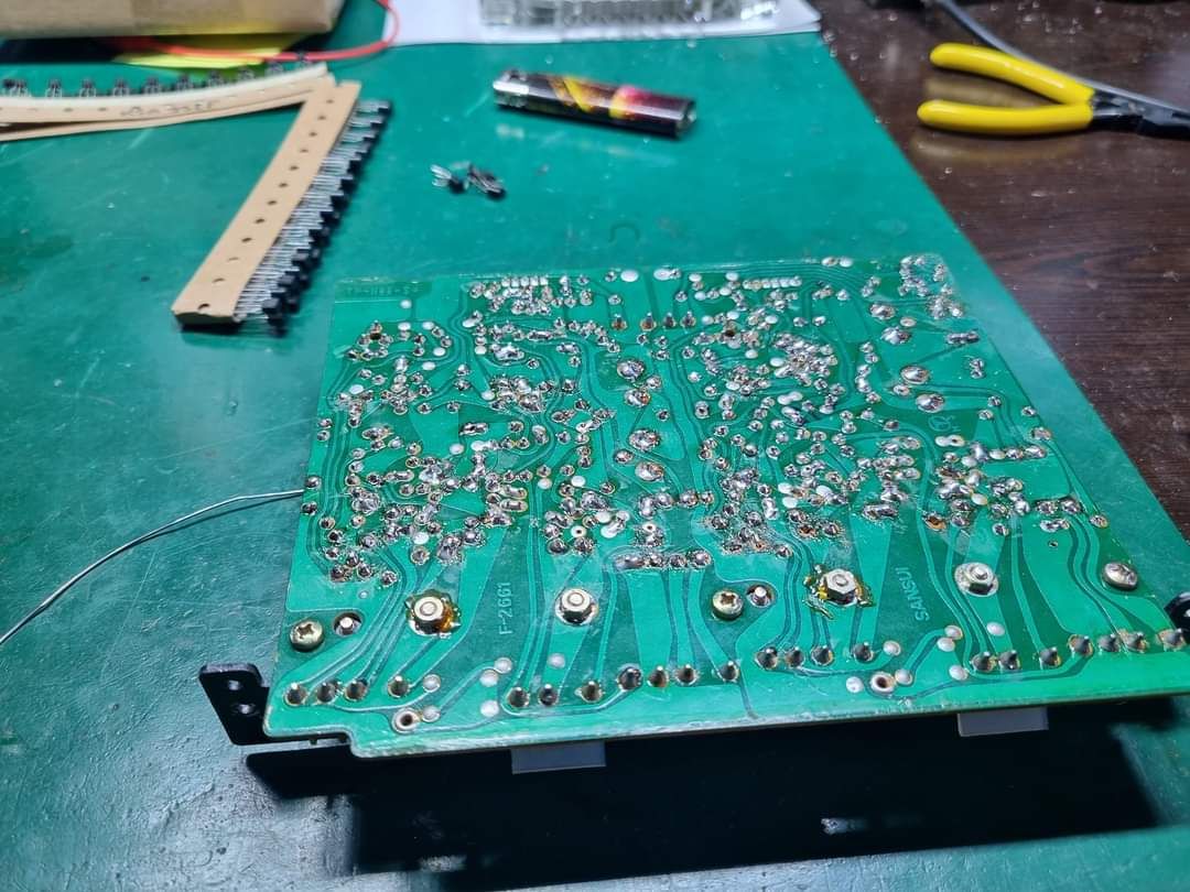 Następne w kolejce były plytki F-2660 gdzie wymiany wymagały 4 tranzystory w skutek poprzednich ingerencji, były to tranzystory TR05 oraz TR06 wymienione na 2SA992,TR03 oraz TR04 wymienione na 2SC1904, poza tym wymienione zostały podwójne tranzystory oraz 8 kondensatorów, wyczyszczony został przelacznik oraz potencjometr głośności, w dalszej części płytki filtrów F-2575 oraz F-2576 na których wymienionych zostało 12 kondensatorów oraz 4 podwójne tranzystory, wyczyszczone zostały oczywiście przelaczniki obrotowe.