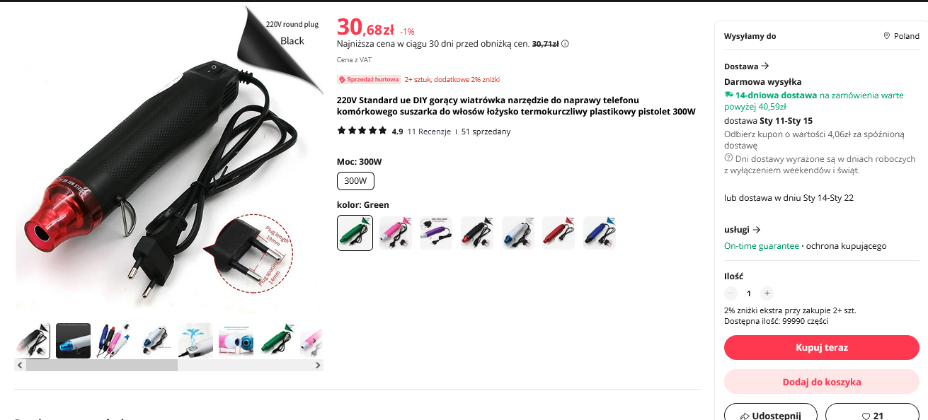 Oczywiście — jeśli ktoś używa H-A na co dzień to inna rozmowa, jednak (jak zapewne Koleżanki i Koledzy zauważyli) w moich artykułach staram się przedstawiać narzędzia/sprzęt dla tych z Was, którzy dopiero zaczynają zabawę z elektroniką, a więc (przynajmniej tak wynika z moich obserwacji) stosujących raczej montaż przewlekany, gdzie Hot-Air nie ma większego zastosowania a jego cena (W PORÓWNANIU DO TEMATYCZNEJ "WIATRÓWKI") to co najmniej kilkakrotność ceny za "wiatrówkę" z tematu.