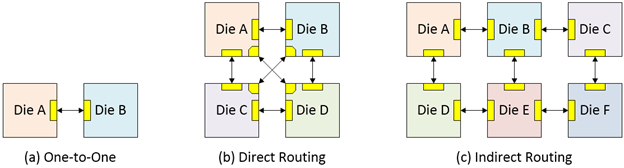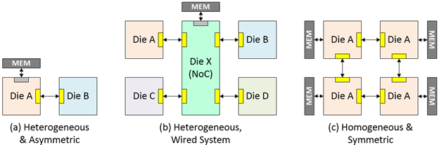Najprostszą opcją jest wykorzystanie tylko dwóch chipletów z bezpośrednimi połączeniami D2D, zilustrowanymi na rysunku 1a. Bardziej zaawansowany przykład obejmuje większą liczbę płytek (rysunek 1b), nadal z bezpośrednimi połączeniami D2D i statyczną konfiguracją trybu mapowania podczas uruchamiania. W przypadku pośredniego routingu D2D z wykorzystaniem przeskakiwania chipletów (rysunek 1c) istnieją dwie możliwości: statyczna konfiguracja trybu mapowania podczas uruchamiania lub dynamiczna konfiguracja trybu mapowania podczas działania. Wszystkie trzy przykłady na rysunku 1 zakładają heterogeniczne chiplety, ale możliwe jest także wykorzystanie wielu homogenicznych (identycznych) w takich układach.