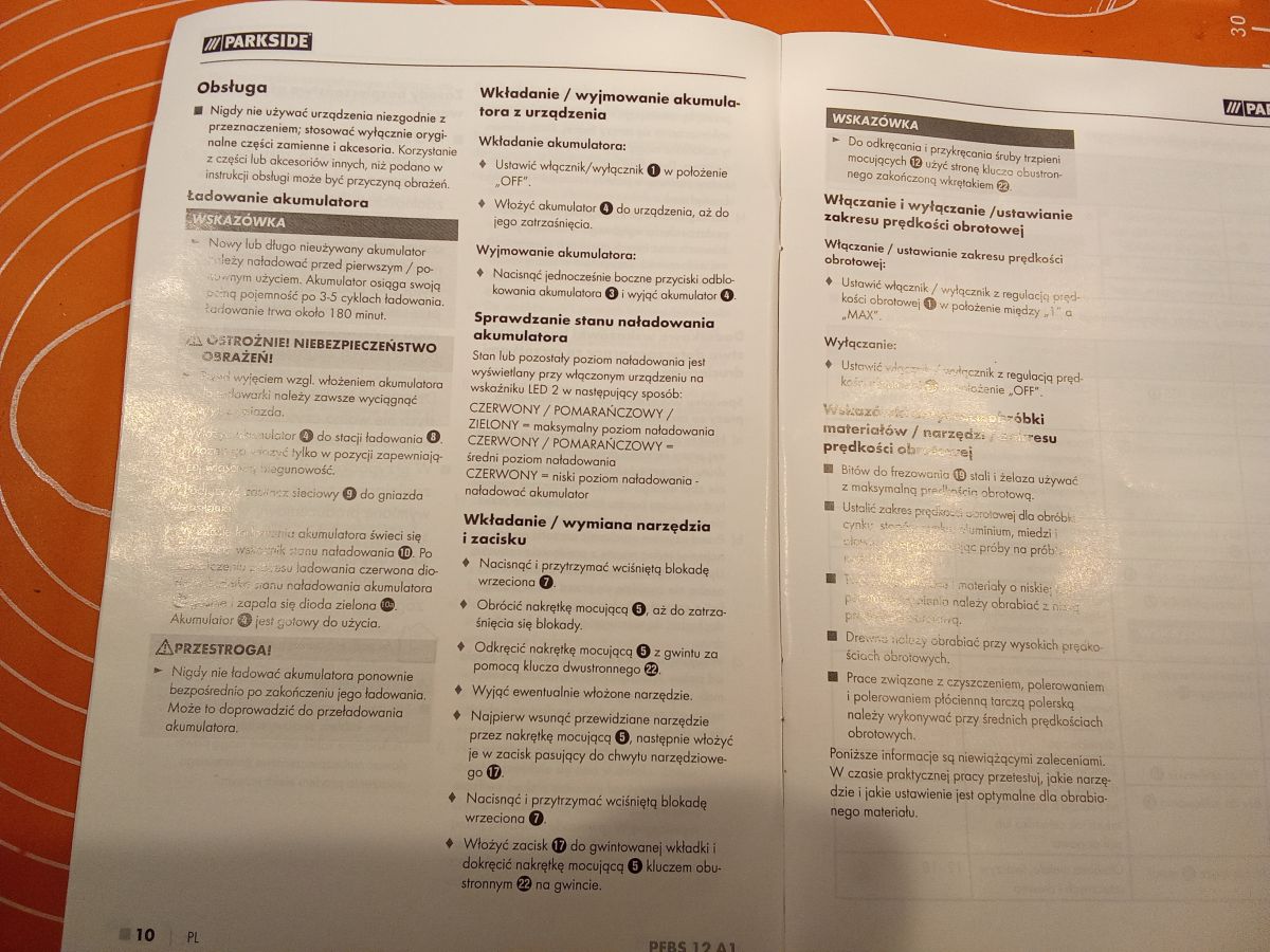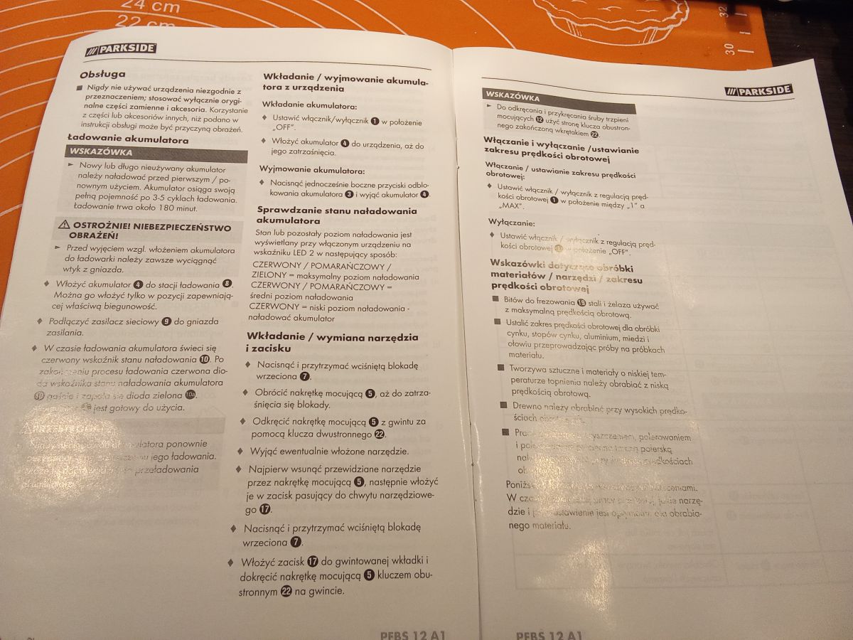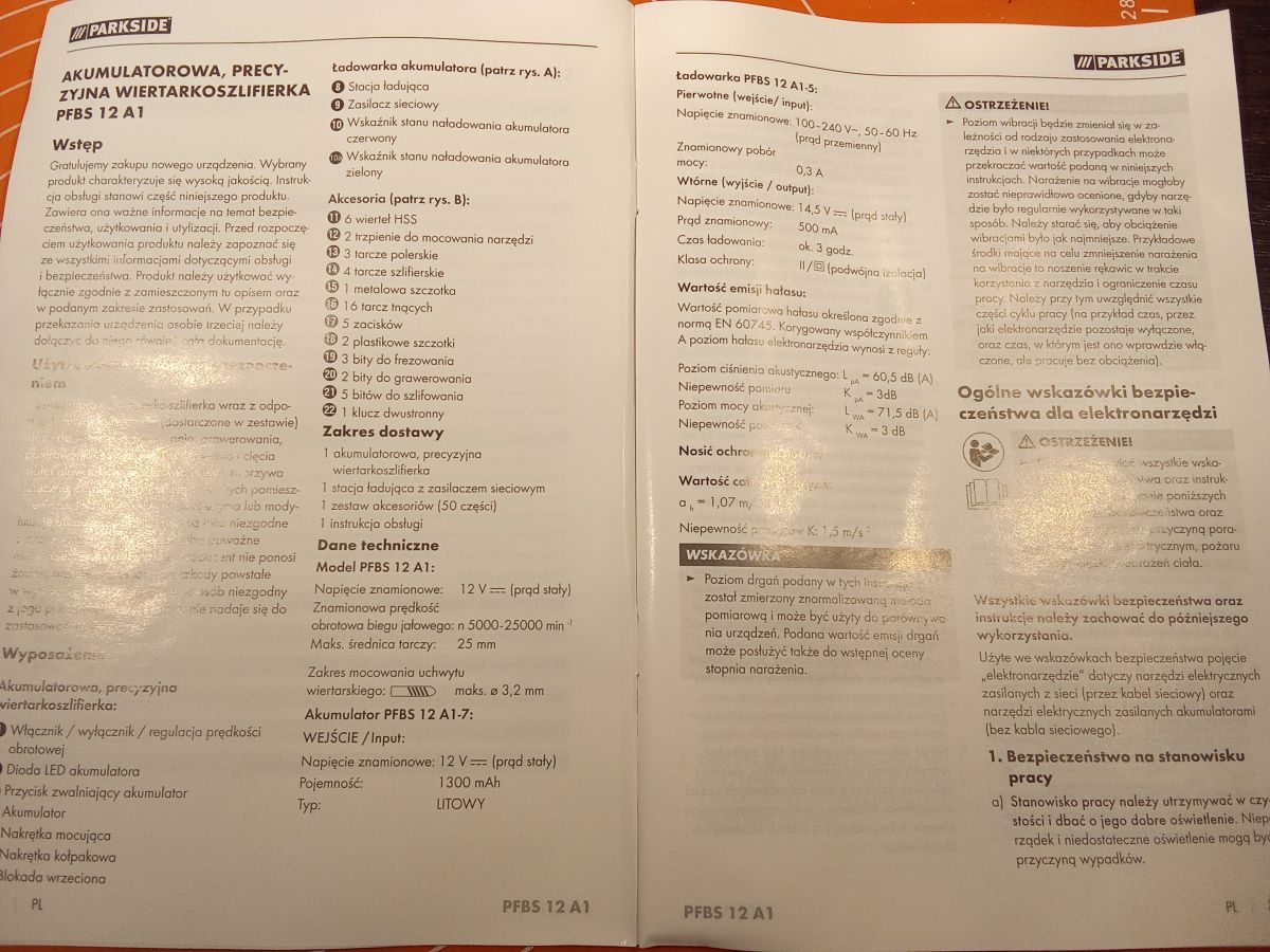 W opakowaniu szlifierki znajdziemy też i instrukcję, a w niej,,, w niej najwięcej uwagi poświecą się bezpieczeństwu użytkowania w/wym. szlifierki. Z jednej strony jest to norma, ale z drugiej... czy to zabawka dla dziecka, czy sprzęt przeznaczony raczej dla dorosłego mechanika/konstruktora? Żebym nie był źle zrozumiany; Nie mam nic przeciwko PRZYPOMNIENIU o konieczności zachowania bezpieczeństwa podczas pracy takim narzędziem, ale czy trzeba, zamiast kilku zdań robić z tego poemat... No nic. Najwidoczniej producent czy dystrybutor wolał się zabezpieczyć...