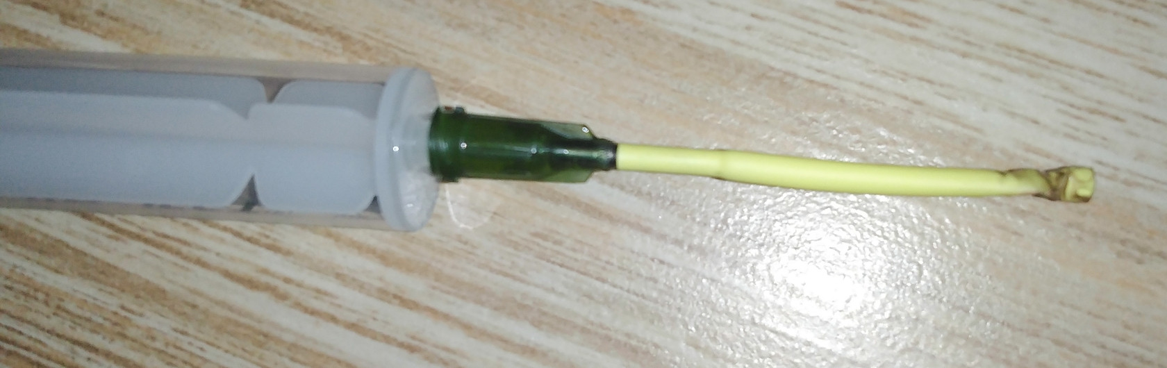 - strzykawka z apteki + gruba igła, dokładnie 2.1mm średnicy zewnętrznej a fi 1.65mm. (Zostawiam na przyszłość, jako, mój "pro" sprzęt serwisowy własnej konstrukcji