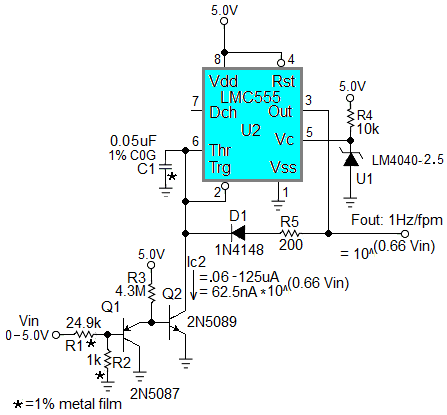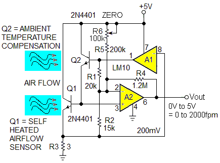 W przedstawionym powyżej obwodzie, Q1 pełni funkcję samorozgrzewającego się czujnika. Jego współczynnik termiczny Vbe przekształca temperaturę na napięcie, które jest następnie przesunięte i przeskalowane przez A2 do zakresu 5 V. Jednocześnie A1 reguluje napięcie referencyjne 200 mV, aby doprowadzić prąd ogrzewający Q1 równy 0,2 V/R3 = 67 mA, co daje stałą moc rozpraszania 67 mA * 4,8 V = 320 mW. Różnica termiki otoczenia i złącza dostarcza odczytu prędkości powietrza, gdy jest chłodzona z różnicą temperatury powyżej otoczenia wynoszącą 64°C przy 0 m³/h, aż do 22°C przy ok. 57 m³/h.
