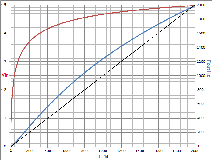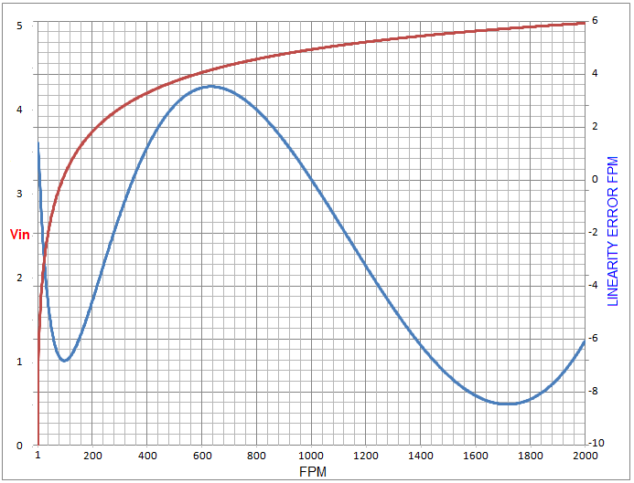 Otrzymana funkcja prędkości powietrza odbiega od idealnej liniowości tylko o -0,4% do +0,2%, co przekłada się na odchyłkę -8 do +4 stóp na minutę, jak pokazano na rysunku 6 i 7 (rozszerzona skala).