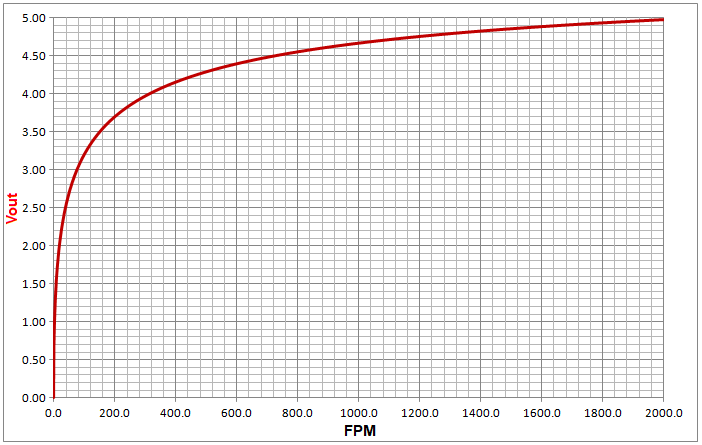 Uzyskanie liniowego sygnału prędkości powietrza w zakresie od 0 do 2000 stóp na minutę z rozdzielczością 1 stopy na minutę wymagałoby rozdzielczości przetwornika ADC 1 na 2000 = 11 bitów. Jednak analiza krzywej na rysunku 2 ujawnia, że mimo iż pełny zakres sygnału prędkości powietrza wynosi 5 V, zmiana sygnału związana z przyrostem prędkości powietrza o 1999 stóp na minutę do 2000 stóp na minutę stanowi tylko 0,2 mV. Aby więc utrzymać pierwszy sygnał na skali, jednocześnie rozdzielając drugi, wymagana byłaby minimalna rozdzielczość przetwornika ADC 1 na 5 / 0,0002 = 1 na 25 000 = 14,6 bitów.