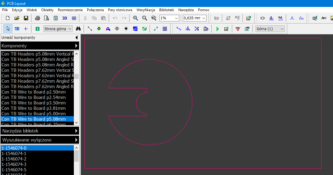 Jak w DipTrace rysuje się nieregularne kształty otworów? Na zdjęciu widać przykładowy nieregularny otwór, który potrzebuje umieścić na płytce. Kształt otworu narysowałem za pomocą narzędzia "Wstaw obiekt", niestety nie wiem jak ów rysunek zamienić w rzeczywisty otwór.