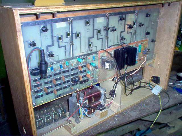 Wczoraj zabralem do domu zegar szkolny, taki z lat 80 oparty na układach UCY i jakimś mikroprocesorze, niestety nie widac jakim. Zegar ten jest na żarówkach, tzn, jedną cyfre tworzy 7 żarówek. Zegar miał być sprawny, ale niestety tak nie jest, brakuje tranzystorów, jest przerobiony ma jakieś dodatkowe mostki, nawet ktoś założył zasilanie na baterie (gdy braknie prądu). Stwierdziłem, ze nie ma sie co bawić, zwłaszcza, że to stary układ, oparty na układach które pobierają srporo prądu - pobór z sieci to 40 W