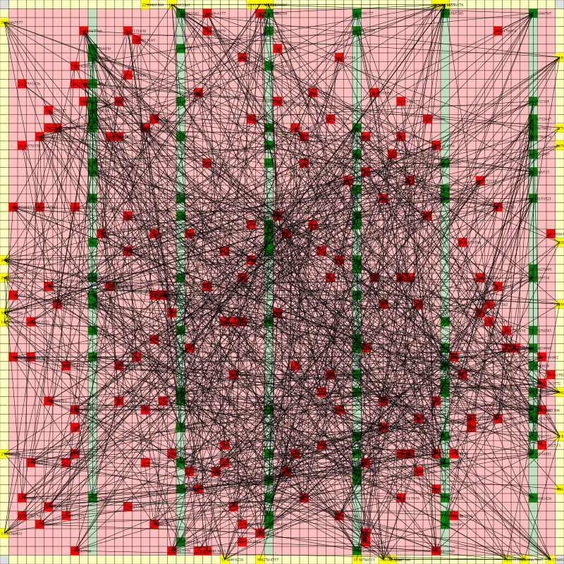 * Mapa rozmieszczenia w FPGA to dwuwymiarowa sieć, w której jedno miejsce może zajmować tylko jeden blok. Typ tego bloku jest ściśle określony i nie można umieścić tam innego jego rodzaju. Istnieją też bloki EMPTY, które należy pozostawić pustymi.