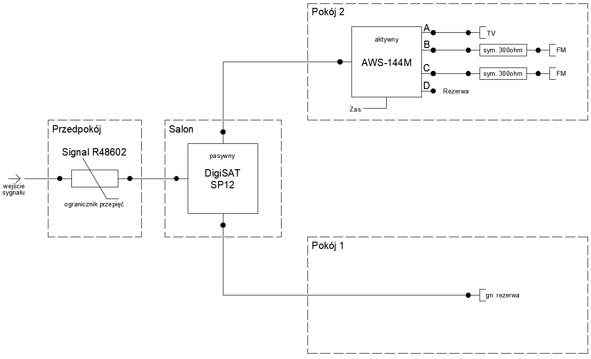 W pokoju 2 sygnał będzie wyprowadzony na gniazdo antenowe. Nie wiem, co dalej powinienem zamontować i prosiłbym o radę. Myślałem, aby dalej zastosować rozdzielacz aktywny AWS-144M i z niego poprowadzić kabel do telewizora (wyjście A), a dwa następne wyjścia do odbiorników radiowych. Na końcu jednego (lub może obu) z kabli zamontowany będzie symetryzator 300 ohm. W ostatnie wyjście zamontować rezystor terminujący. Czy taka konfiguracja ma sens? Czy coś wypadałoby pozmieniać?