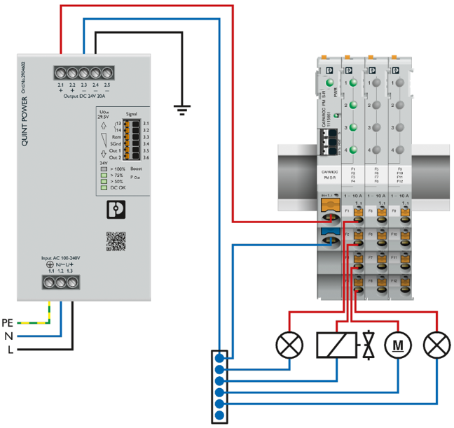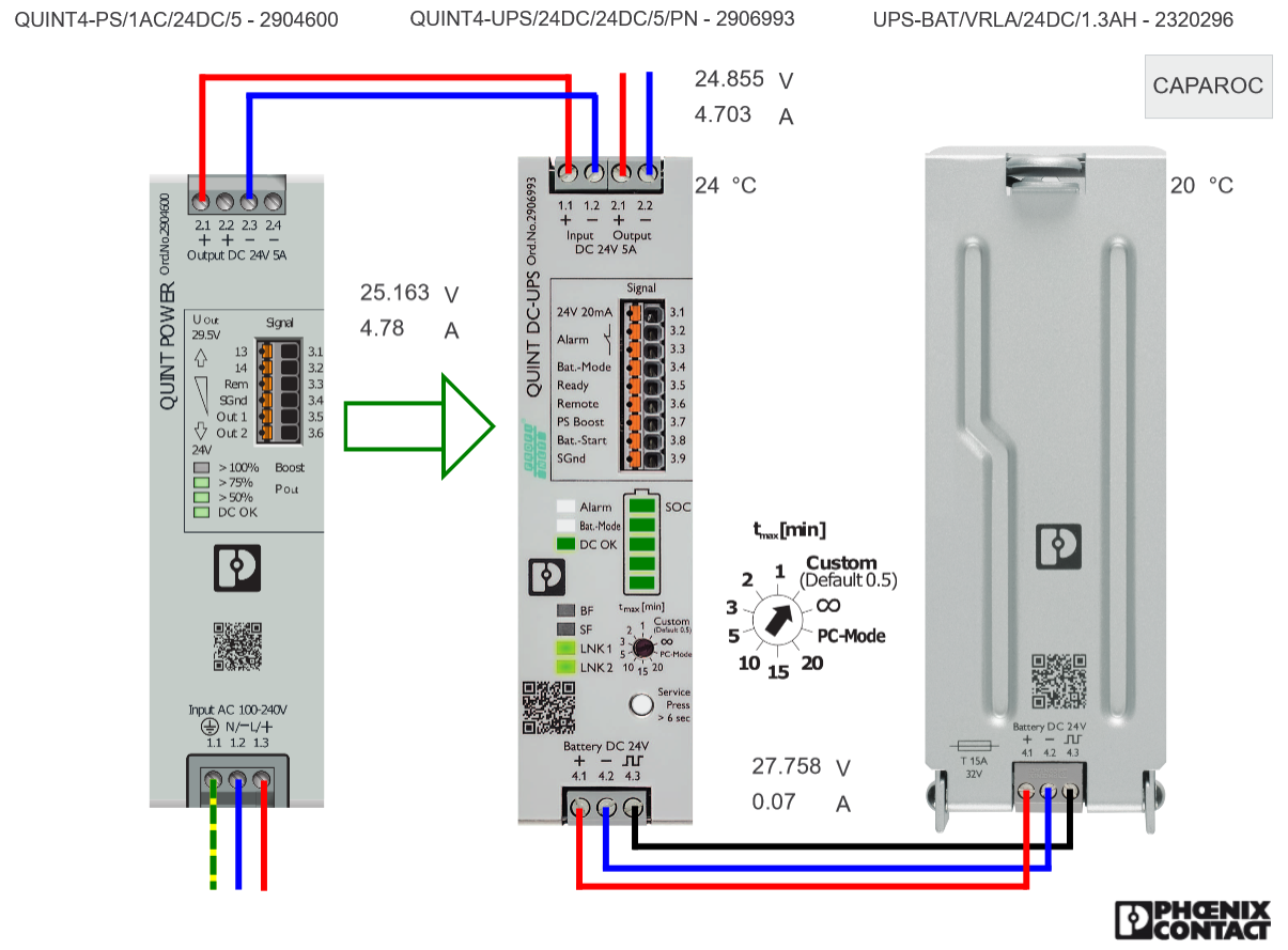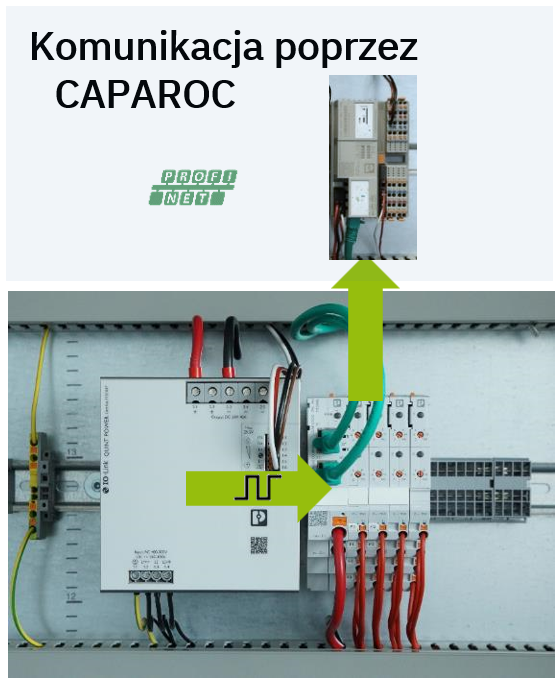 System CAPAROC może stanowić wyposażoną w komunikację część zestawu zasilania. Poprzez osobne złącze komunikacyjne CAPAROC może zbierać informacje np. z zasilacza serii QUINT4, przez co mamy pełniejszą kontrolę (np. dodatkowa informacja o aktualnym obciążeniu zasilacza, czasie pracy czy temperaturze).