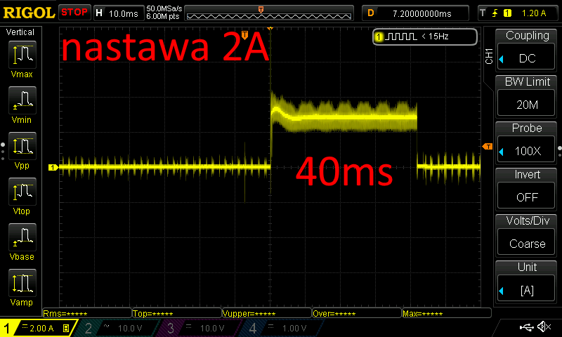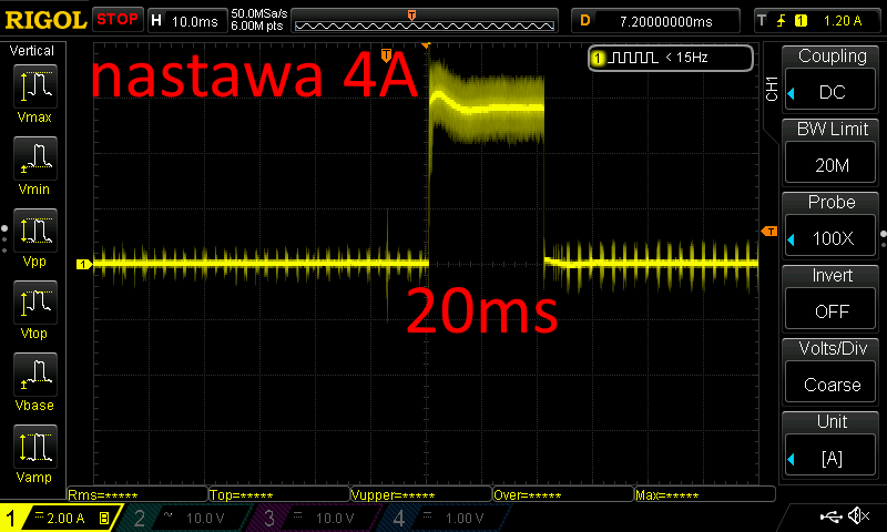 Poniżej widoczne jest działanie aktywnego ograniczania prądu zwarcia. Dla nastaw 2A i 4A prądy i czasy zadziałania są różne: