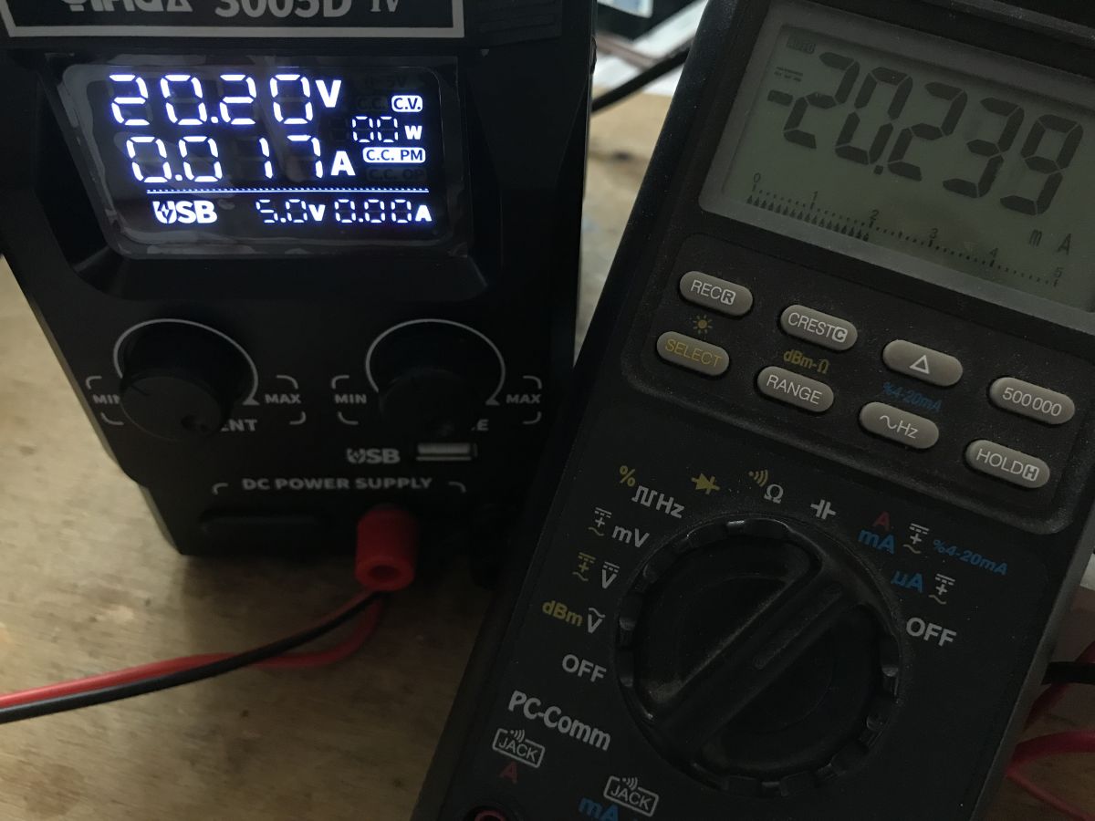 Napięcie 20.2V - nastawiony prąd 17mA, multimetr pokazuje 20mA:
