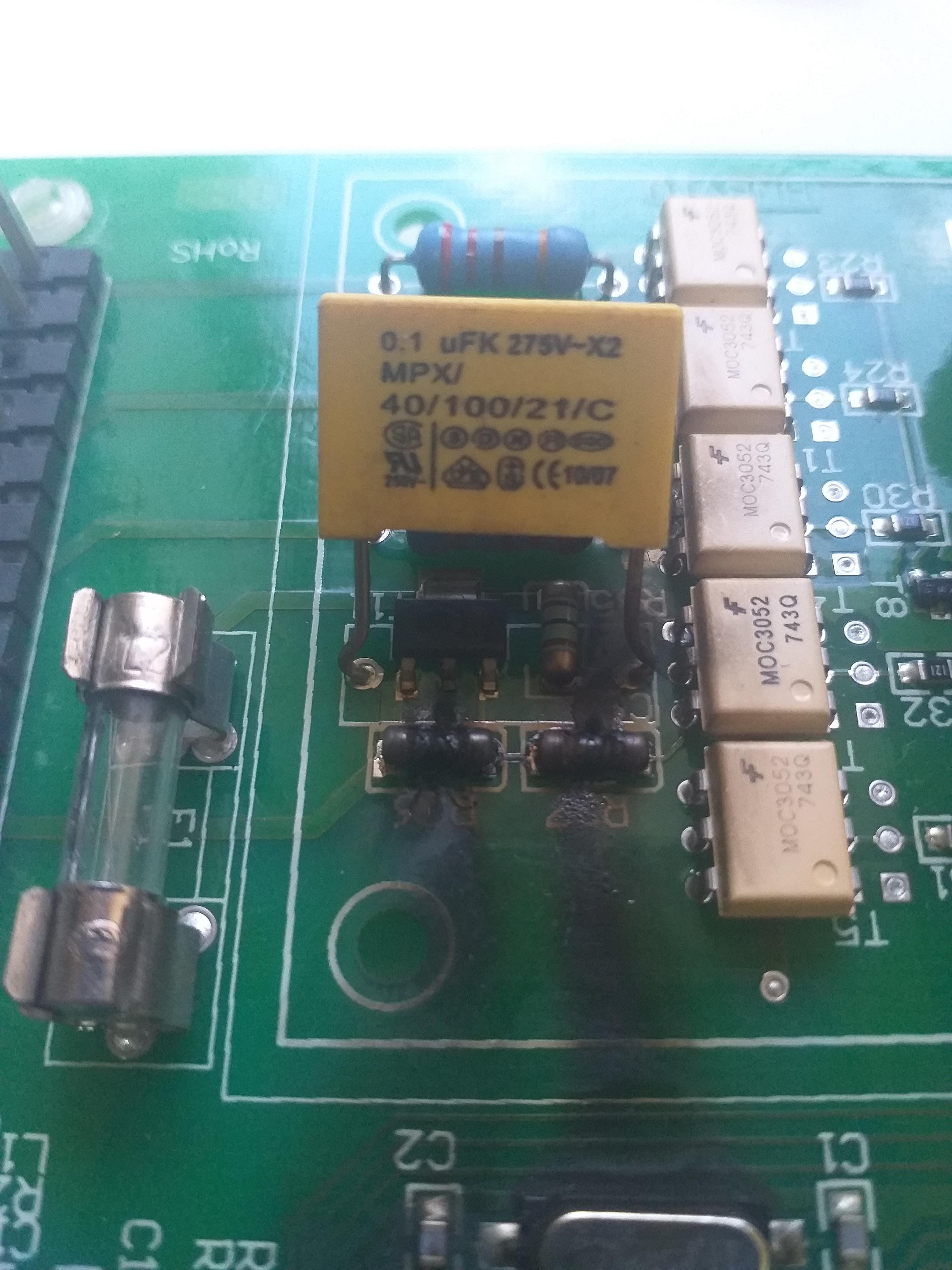 Ten rezystor po lewej to R36: 100 ohm, ten po prawej to R37: 4,7 kohm, a tranzystor smd to triak na 600V 1A steruje cewką zaworu napełniającego.