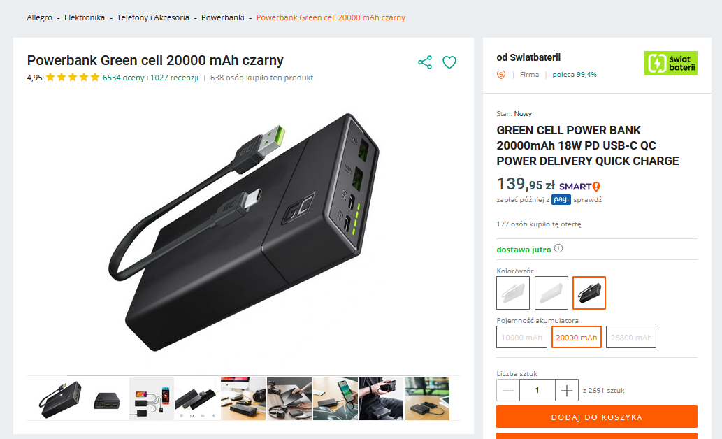 Model 20000mAh, choć ma dwukrotnie większą pojemność, kupimy za niecałe 150 zł: