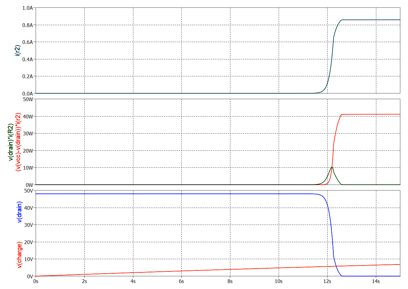 Wykres prądu (na górze): pokazuje trend prądu płynącego przez obciążenie R2 (zielony) oraz kanał DS tranzystora MOSFET. W pierwszych 12 sekundach nie ma przepływu prądu, a obciążenie jest wyłączone, ale po tym czasie aktywuje się praktycznie w ciągu sekundy. Przełączanie nie jest nagłe, ale prąd zmienia się w obliczu wzrastającego napięcia, z nieliniowymi komponentami.