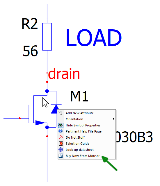 Przejdźmy teraz do części komercyjnej projektu, czyli do zakupu użytych w schemacie komponentów elektronicznych. Nie wszystkie elementy obwodu trzeba zamawiać online, ponieważ te z nich, które są niezwykle powszechne, można również znaleźć w lokalnych sklepach. Aby złożyć zamówienie online, wystarczy kliknąć prawym przyciskiem myszy na interesującym nas komponencie i wybrać pozycję: „Kup teraz od Mouser”, jak pokazano na rysunku 3. W odniesieniu do tego schematu elektrycznego, jedynym elementem, w który można zaopatrzyć się online, jest tranzystor MOSFET SiC UF3C065030B3. Dla innych menu kontekstowe nie wyświetla tej funkcji.