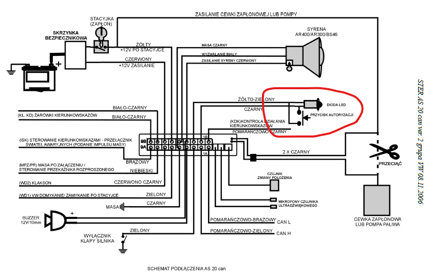Witam. Kupiłem samochód z tym alarmem. Nie mam wyprowadzonego przycisku autoryzacji. Znalazłem schemat tylko do STER AS 20 i tam przycisk autoryzacji jest podpięty pod diodę. Nie mam pewności czy w AS 10 też tak można zrobić nie chce spalić albo zablokować. Może ktoś ma schemat albo jakaś rada byłbym wdzięczny.