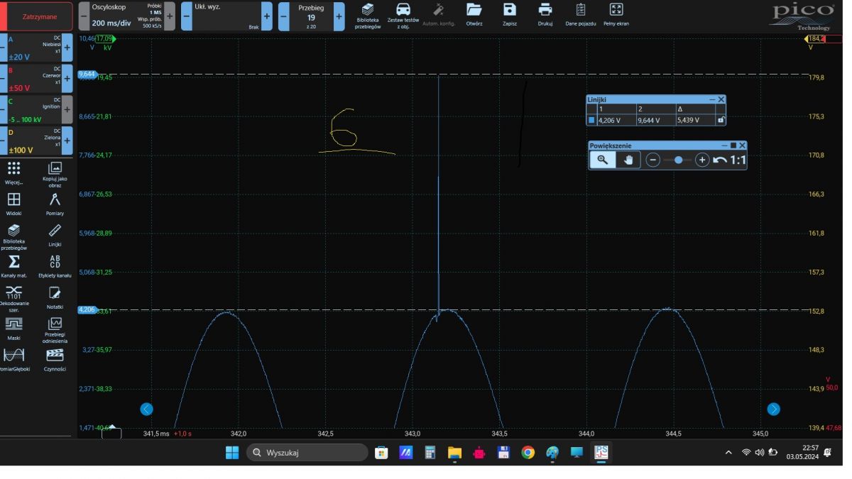 Przeprowadziłem pomiar czujników wału, wałka, wtryskiwacza i cewki cylindra 4. Okazuje się, że po każdym wyładowaniu się cewki pojawia się minimalna lub bardzo duża anomalia na czujniku wału. Duża anomalia powoduje wypadanie zapłonu i jeszcze bardziej nierówną pracę silnika. Minimalną anomalię można zauważyć także w przebiegu czujnika wałka i napięciu wtryskiwacza. Co jest powodem takich zachowań? Dołączyłem zdjęcia.