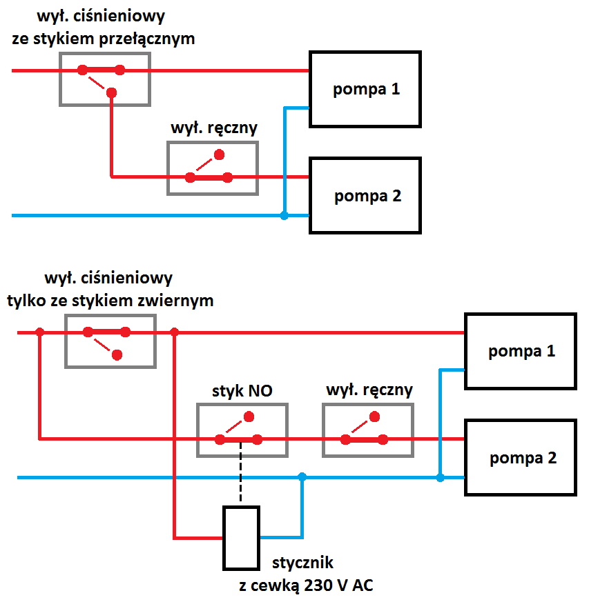 Dzień dobry, chcę sterować dwoma pompami elektrycznymi na jednej linii ssawnej. Mały przekrój rury ssawnej nie pozwala na pompowanie wody dwoma pompami jednocześnie. Tak więc pompa główna na hydroforze 240 V 1300 W załączona załącznikiem ciśnieniowym z hydroforu jest pirotetowa. Jeżeli pracuje druga pompa 240 V 1000 W służy do nawadniania, musi być wyłączona uruchomiona ręcznym wyłącznikiem. Czyli jeżeli pracuje, musi zostać automatycznie wyłączona, gdy uruchomi się hydrofor. Czy jest w sprzedaży takie urządzenie sterujące, czy zachodzi potrzeba własnej konstrukcji? Dziękuję, pozdrawiam, Grzegorz