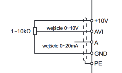 Podłączyłem sterownik firmy Apar AR652 z wyjściem właśnie 4-20mA do wejścia AVI przemiennika SX 1000. Wyjście 8 ze sterownika AR652 do wejścia AVI "falownika", wyjście 5 (gnd) do gnd przemiennika. Miliamperomierz załączony równolegle do styków pokazuje przepływ prądu jaki ma być. Przemiennik nie reaguje niestety, częstotliwość 0.