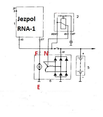 Witam. Mam zamiar zmienić regulator alternatora z powodu uszkodzenia na reg Jezpol RNA-1. Alternator ma 6 diod ,a jego wyprowadzenia to F,N,E i 30 .W załączniku narysowałem schemat. Czy kontrolka ładowania będzie działać ?