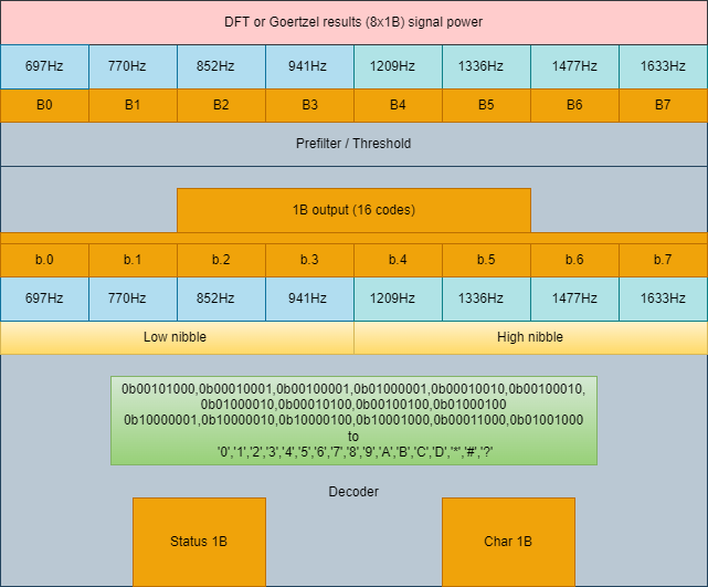 W przypadku odbiorników jest już szersze pole do eksperymentowania. W celu uzyskania optymalnych rezultatów, warto użyć odpowiednio niskiej częstotliwości próbkowania oraz odpowiedniego rozmiaru ilości próbek dla DFT. Należy pamiętać, że zwiększając częstotliwość próbkowania, zmniejszamy rozdzielczość widmową transformacji, co z kolei wymusza zwiększenie ilości zebranych próbek dla zachowania możliwości rozróżniania zadanych częstotliwości. Tak więc, również ze względu na pobór mocy, częstotliwość próbkowania warto wybrać taką która tylko z małym zapasem zapewnia poprawne samplowanie zakresu dekodowanych tonów. Umożliwi to użycie stosunkowo niskiej ilości próbek transformaty. SR=6kHz oraz 128 sampli jest wystarczające do prawidłowego działania tak skonstruowanego dekodera. Czas jednej transformacji wynosi 6kHz / 128 = 21ms. Z taką teoretyczną prędkością można by zmieniać tony dla poprawnego ich rozpoznawania. W praktyce jednak bardziej zależy nam na nie występowaniu „fałszywych alarmów”, a te są nieuniknione w przypadku braku 'uśredniania' zdekodowanych znaków. Po doprowadzeniu sygnału szumu białego o wysokiej amplitudzie, dekoder zwraca przypadkowo zinterpretowane znaki. Zmniejszenie amplitudy sygnału, przekłada się na proporcjonalne zmniejszenie występowania fałszywych interpretacji szumu jako sygnał użyteczny. Dopiero po zastosowaniu sprawdzania kilku kolejnych takich samych znaków (minimum 3) sytuacja przypomina bardziej to, z czym mamy do czynienia na wyjściu dekodera sprzętowego, czyli brak znaków wyjściowych w reakcji na sygnał szumu. W tym miejscu jednak spotykamy się z ograniczeniem możliwości filtracji wyjściowej w kontekście wymaganej minimalnej długości czasu sygnału wejściowego. Podane wyżej parametry SR oraz ilości próbek, są właściwie wartością graniczną dla 50ms czasu tonu wejściowego (dla pełnej czułości dekodera należałoby zwiększyć SR do 8KHz co daje czas 3 transformacji na poziomie 48ms). Uzyskanie braku fałszywych interpretacji szumu jest możliwe dopiero po zmniejszeniu czułości dekodera (parametry w programie), co spowodowało, że rozkład mocy szumu, nigdy nie osiągnie progów detekcji, jednak dla poprawnych sygnałów dtmf pozostanie zapas kilku dB. Byćmoże z wyżej wymienionych przyczyn do celów dekodowania dtmf w procesorach sygnałowych używane są raczej algorytmy, oparte o filtrację sygnału, np. algorytm Goertzela. Być może są też algorytmy działające podobnie do układu MT8880 (w skrócie dwa strome filtry dla grup tonów wysokich i niskich, oraz liczniki przejścia przez zero fali w celu pomiaru częstotliwości składowych). Bardzo ciekawy przykład dekodowania dtmf oparty jedynie o czasy pomiędzy przejściami przez zero znalazłem w ty miejscu:http://www.romanblack.com/DTMF/DTMF_alg.htm