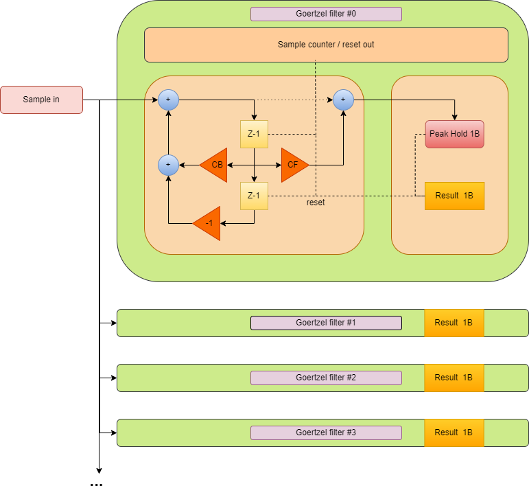 Na zakończenie eksperymentów, postanowiłem napisać implementację dekodera DTMF z użyciem owego filtra. Okazał się on bardzo zbliżony do filtra z nieskończoną odpowiedzią impulsową, więc od budowy takiegoż właśnie zacząłem. Gdy już zrobiłem najzwyklejszy biquadowy filtr IIR w postaci 2, wystarczyło go nieco zmodyfikować by mógł posłużyć za wąski filtr pasmowy do badania składowych widma. W celu pomiaru wartości, program został wyposażony w miernik wartości szczytowej sygnału, oraz licznik, który resetuje pamięć próbek, oraz 'peak hold' równocześnie zapamiętując wartość wynikową. Program Gfilter operuje na 8bit próbkach wejściowych i 16bit próbkach w samym filtrze, współczynniki mnożenia są również 8 bitowe, przy czym max wartość wzmocnienia w sprzężeniach wynosi x4 (taki FMULSU x2). Niska rozdzielczość wymusza konieczność dobrania wartości, które nie spowodują zbyt szybkiego nasycenia się 16b rejestrów. W mojej implementacji usunąłem bezpośrednie połączenie sygnału wejściowego z wyjściowym, w celu lepszej obserwacji danych będących wynikiem działania algorytmu. Optymalna ilość obliczanych próbek wynosi około 200, co umożliwia podobnie jak w przypadku implementacji z DFT użycie ”filtracji większościowej” co poprawia odporność na przypadkowe interpretacje znaków, kosztem dłuższego czasu analizy sygnału. W przypadku programu Gfilter, użyta została częstotliwość próbkowania o wartości 8kHz, dla której czas jednej ramki pomiarowej wynosi 12.5ms. Tak krótki czas pomiaru widma umożliwia bezproblemową detekcje sygnałów o długości 50ms nawet po użyciu wspomnianego wcześniej uśredniania. W przypadku detektora dtmf w oparciu o filtr byłem nieco rozczarowany faktem, iż ilość mocy obliczeniowej potrzebnej do uzyskania należycie niezawodnych wyników była porównywalna do implementacji z DFT, jednak reakcja dekodera w tym przypadku była o wiele szybsza (można by dekodować nawet 25ms sygnały).