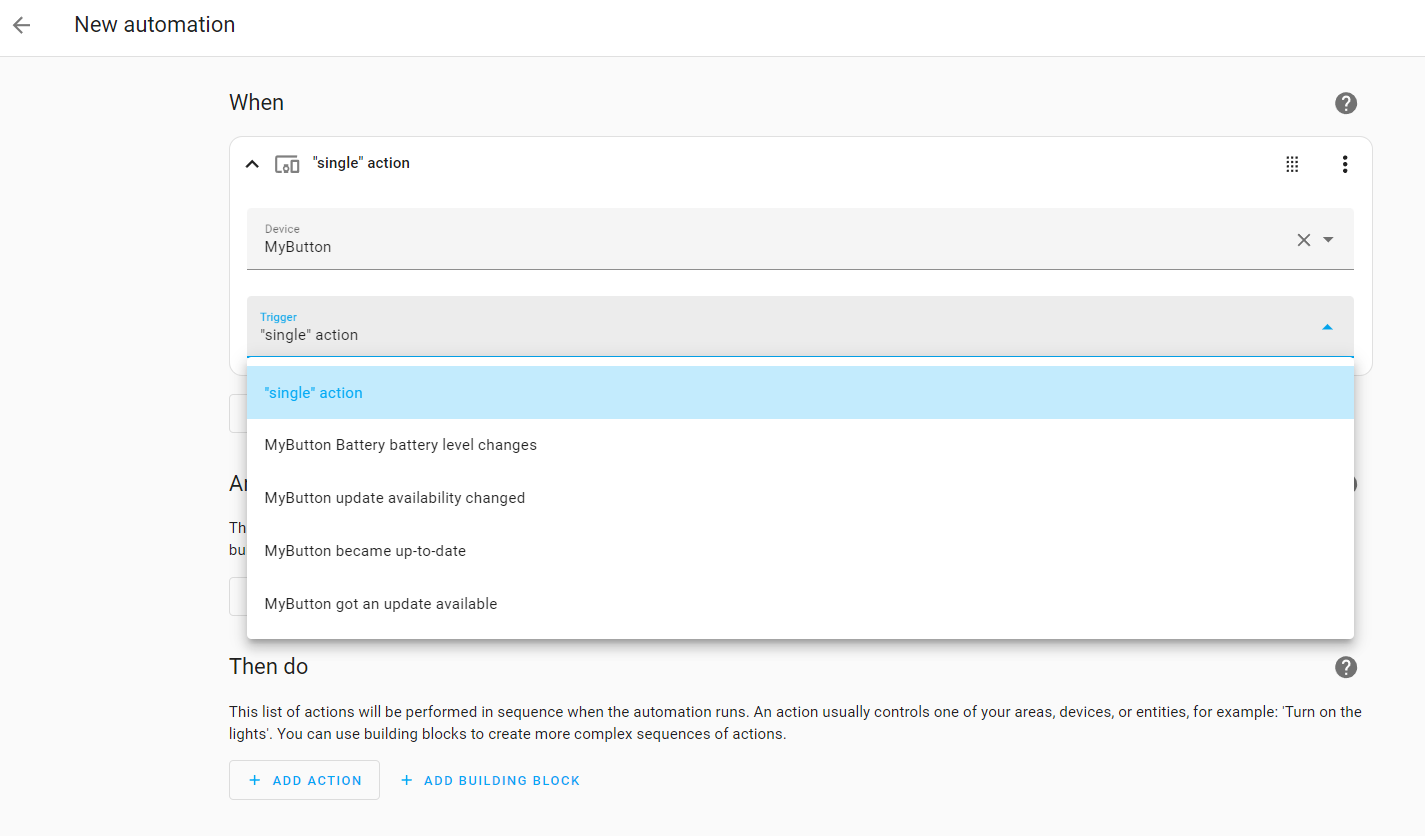 Tworzenie zaczynamy od wyboru wyzwalacza, tutaj wybieram zdarzenie "single" (pojedyncze kliknięcie przycisku):