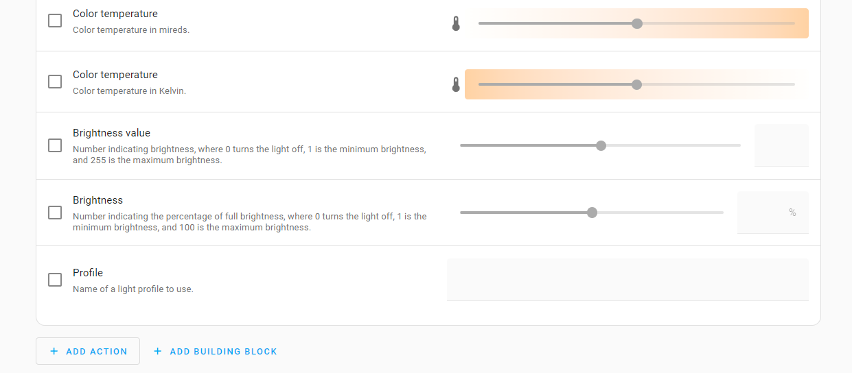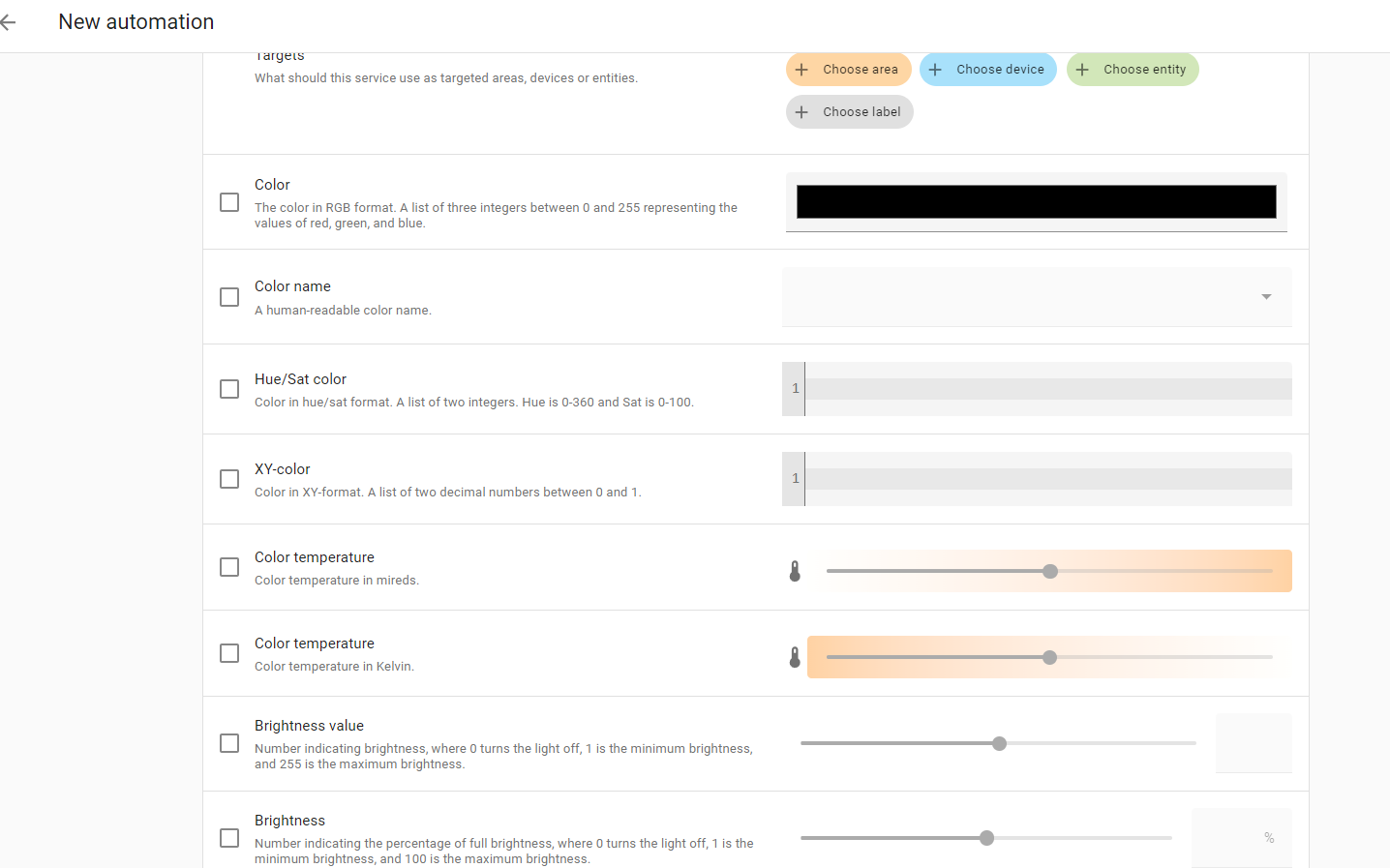 Można też dowolnie wybierać ustawienia światła - poziom jasności, temperaturę bieli, barwę RGB, itd: