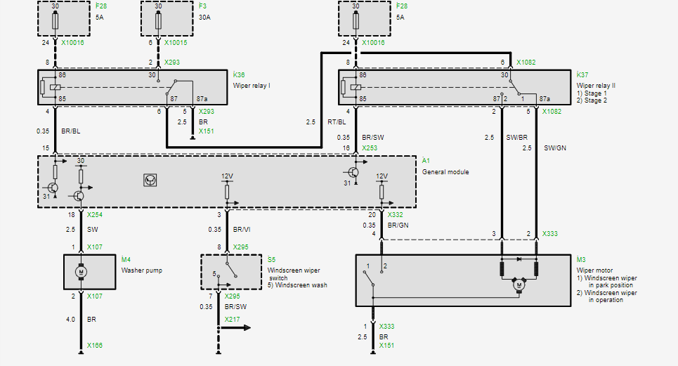 #2 21164298 22 Lip 2024 23:09 quaczuq quaczuq Poziom 15 Pomocny post? (0) #2 21164298 22 Lip 2024 23:09 Proszę, to schemat samych wycieraczek. Pytanie co nie działa bo jest jeszcze inny jak jest docisk wycieraczki kierowcy i czujnik deszczu. k36 k37 to fioletowe w skrzynce pod sterownikiem skrzyni i silnika zazwyczaj są zalane.