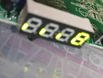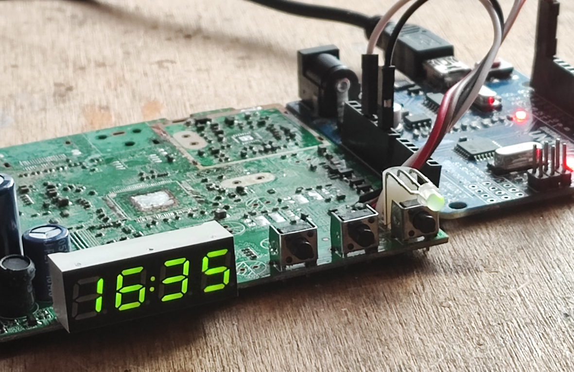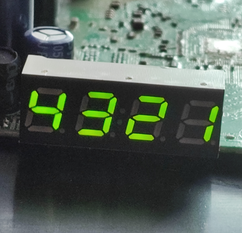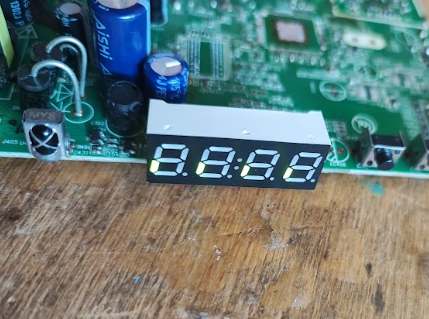 Wyświetlacz udało się uruchomić, chociaż nie obyło się bez pomyłki (źle oceniłem, że bit 7seg powinien być 1, a powinien być 0, gdyż tu ósmym segmentem jest dwukropek). Dodatkowo okazało się, że kropki nie są nigdzie podłączone, więc w tej formie temperatury nie wyświetlimy. Można by spróbować rozważyć jakąś modyfikację, nie wiem, może przełączyć kropki pod dwukropek a dwukropek odpiąć lub do MCU podłączyć do wolnego GPIO, musiałbym sprawdzić dokładniej PCB.